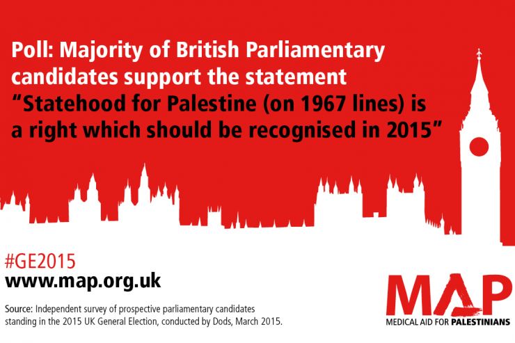 The survey, commissioned by Medical Aid for Palestinians (MAP) and published today, found that 89% of responding candidates either ‘strongly agree’ or ‘tend to agree’ with the statement “statehood for Palestine (on 1967 lines) is a right which should be recognised in 2015”.